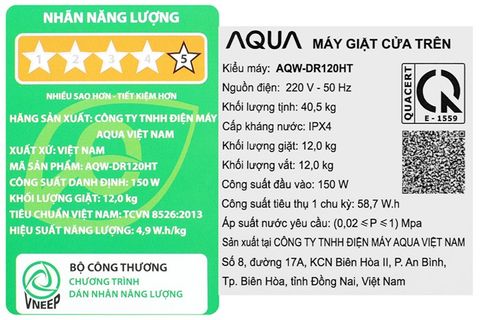 - Nhãn năng lượng đạt 5 sao với hiệu suất sử dụng điện 4.9 Wh/kg.