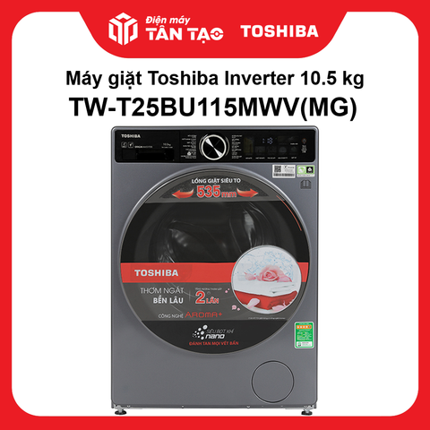 Máy giặt Toshiba Inverter 10,5 kg TW-T25BU115MWV(MG) thuộc dòng máy giặt lồng ngang - cửa trước thiết kế hiện đại, trang bị 14 chương trình hoạt động cài đặt sẵn, công nghệ UFB siêu bọt khí NANO đánh bay vết bẩn dễ dàng, công nghệ Aroma+ giặt quần áo mềm mại, thơm tho, công nghệ Great Steam diệt khuẩn tối ưu, kết nối Wifi, điều khiển bằng điện thoại từ xa qua TSmartLife tiện lợi.