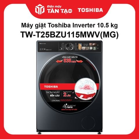 Máy giặt Toshiba Inverter 10.5 kg TW-T25BZU115MWV(MG) thuộc kiểu máy giặt lồng ngang – cửa trước với thiết kế tinh tế, sang trọng, tích hợp công nghệ siêu bọt khí nano UFB giặt sạch áo quần không còn vết bẩn và cặn xà phòng, khả năng diệt khuẩn hiệu quả 99.99% nhờ công nghệ Great Steam, công nghệ Color Alive giảm phai màu bảo vệ quần áo tối ưu,… cùng nhiều tiện ích thông minh khác.